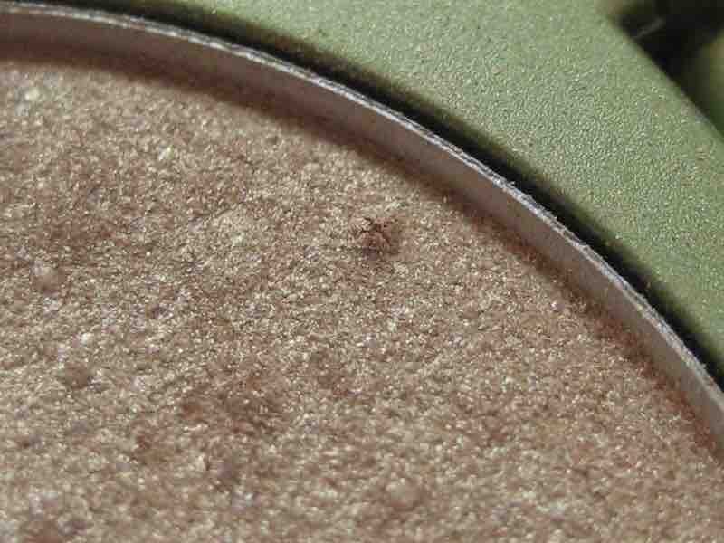 Ja es fing an mit kleinen Krümelchen drauf, die ich mir nicht erklären konnte. Danach folgten diese kleine Löcher und Erhebungen, so ca in diesem Stadium hab ich’s dann weggepackt und erstmal vergessen. 2 Monate später wollte ich den Blush benutzen und ich hatte kleine Viecher drauf rumflitzen… sah genauso aus, wie diese kleinen Tierchen, die sich manchmal in ungeschützt aufbewahrten Mehltüten breitmachen.