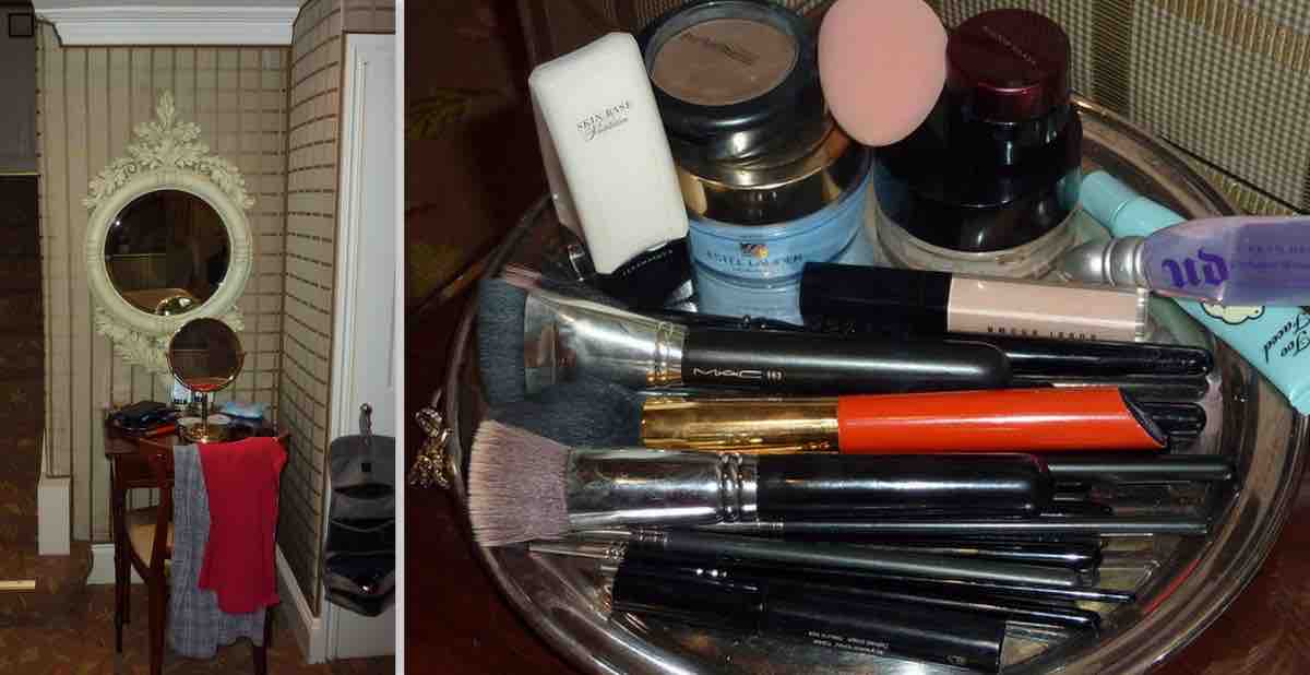 Und hier noch ein Blick auf meinen Schminktisch im Hotel! Meine meist gebrauchten Pinsel, sowie die bei jedem Makeup verwendeten Produkte hab ich dort offen liegen gelassen, den Rest in meiner Makeup-Tasche, die ich praktischerweise direkt daneben an einen Schranktürgriff hängen konnte: