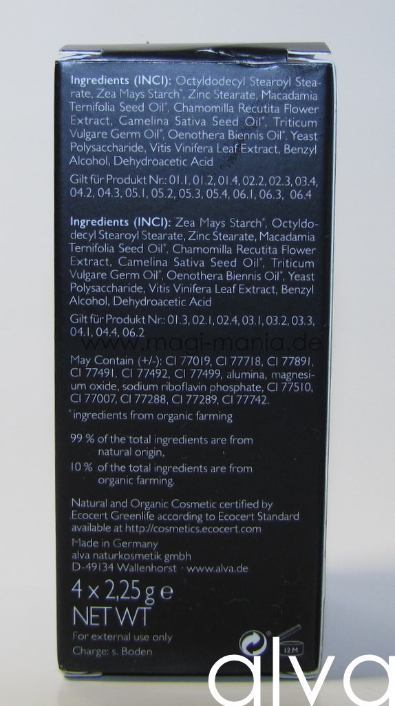 Zum NK-Joker noch, genauer: Dem INCI-Faktor: Für ältere Beauties wird der immer ausschlaggebender. Also vor meinem 35sten Lebensjahr sind mir viele Sachen gar nicht so stark aufgefallen wie heute. So habe ich bei den MAC-Piggies mitnichten einen pflegenden Anti-Aging-Effekt, den mir die ALVA Türmchen über die enthaltenen, hochwertigen Öle gleich mitliefern. Ich dachte zuerst, ich hätte mir das nur eingebildet, dass die Haut meine Lider in den letzten Wochen wie aufgepolstert und viel geschmeidiger erscheint. Dachte, ich hätte einfach besser gecremt oder so. Bis meine Mutter, die Heilpraktikerin ist, meinte: Nö, wieso – Du arbeitest doch sehr hochwertige Öle mit nachweislichen AA-Wirkungen beim Schminken auch noch richtig in die Haut ein mit den Pinseln. Klingt äußerst logisch. Ein letztliches Resümee habe ich aber noch nicht, ich habe das weiter in Beobachtung; werde den Langzeit-Test machen und auch mal den Wechsel-Test, also Hautzustand der Lider nach mehreren Wochen wieder nur MAC Piggies etc.