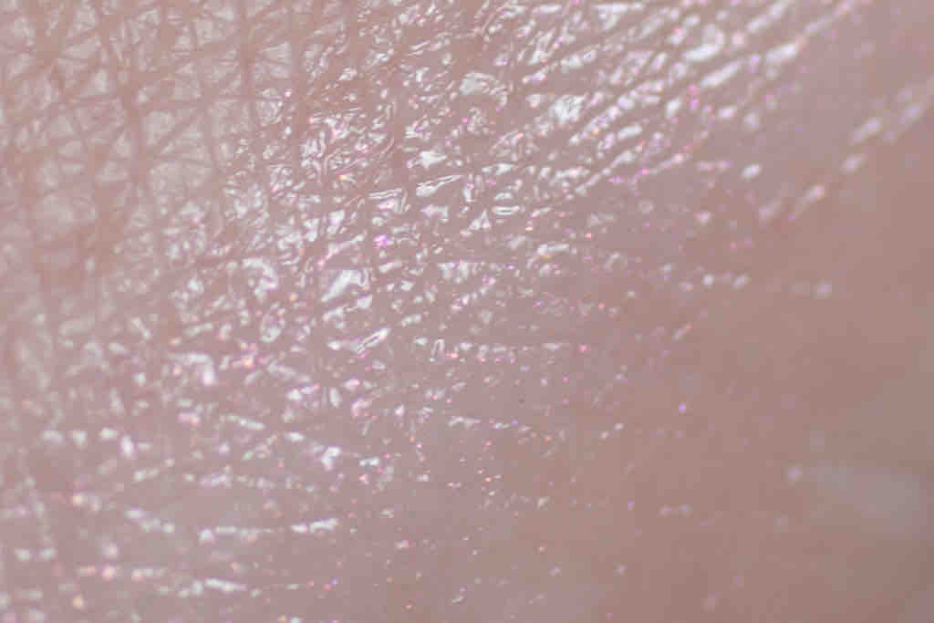 Was mich zum Kauf verleitete, waren die schimmernden Partikel, die beide Nuancen hinterließen. Beide enthalten rosa Flocken; der eine zusätzlich eher bläuliche, dieser hier goldene.