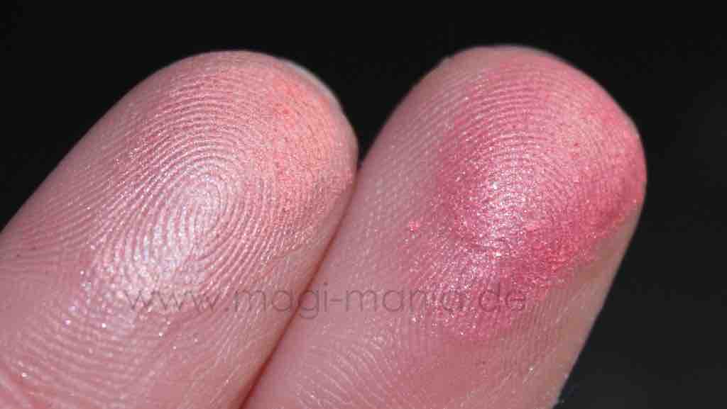 Die Farbe erkennt ihr sicherlich am besten im Bild – ein Pink nach deutscher Definition ist es nicht. Ein sattes Rose mit viel Pfirsich und nur einem dezentem goldenem Schimmer. Diese kleine Portion Perlglanz auf den Wangen macht ihn nicht zu der erwarteten pinken Version des ‚Coralista‚, der auf getragen im Grundton so viel anders gar nicht ist, aber der durch die Masse an Glanz einfach völlig anders herauskommt. Wem es zu viel war, wird hier vielleicht eine Alternative finden. Die Textur ist ansonsten sehr ähnlich und nicht so trocken wie beim ‚Thrrrob‚. Auch noch ein Stück geschmeidiger als ich ich ‚Dallas‚ in Erinnerung habe. Ich finde sie sehr gelungen, denn trotz intensiver Farbabgabe hat man das Puder sehr gut in Griff und das Ausarbeiten ist mühelos und streifenfrei.