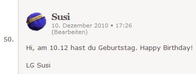 Aber es gab ja noch eine Frage am 10. – oh man, es war echt schwierig sich zu beherrschen euch allen nicht DAAAANKE zu schreien – ihr seid sooo lieb – daher DANKE an alle für ihre Geburtstagswünsche. Das war nämlich auch die richtige Antwort. Hier ist die Gewinnerin: