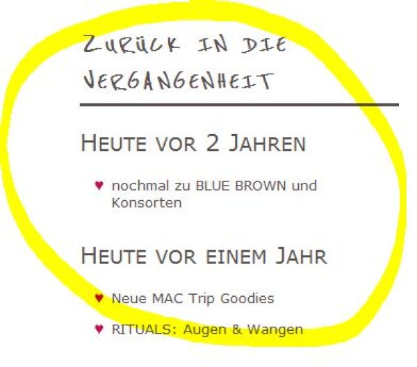 - neues Widget rechts in der Sidebar: ‚Zurück in die Vergangenheit“ – zeigt die Posts, die vor genau einem bzw. zwei Jahren auf dem Blog veröffentlicht wurden