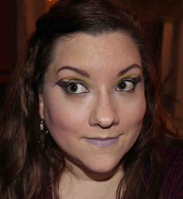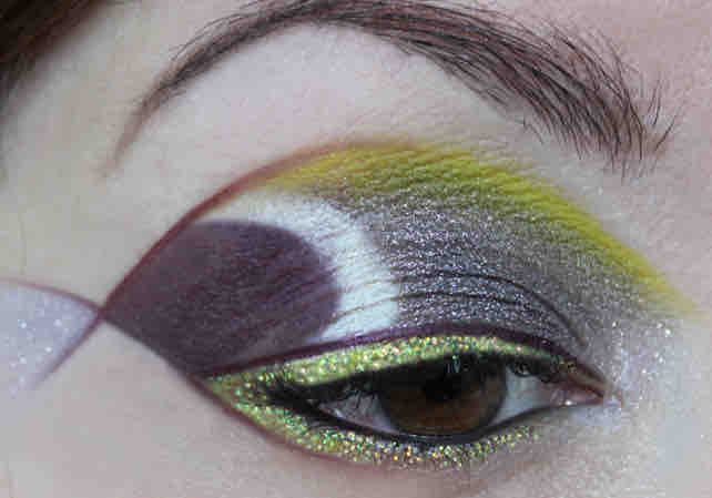 Auf der Außenseite des Rings hab ich als den dunklen Fleck Ben Nye Violeta aufgetragen. Dann kamen die Lidstriche. Direkt um das Auge herum hab ich dafür den MAC Glitter Crystalled Yellow (plus Mixing Medium) gewählt. Umrandet wird dieser von einem zweiten Lidstrich, erneut vom Kryolan Liner Aubergine. Am oberen Lid auf kompletter Länge, am unteren in sanft verblendetem Auslauf nur im äußeren Drittel. Für die Schwanzflosse hab ich anschließend den oberen Kryolan Lidstrich und den unteren jeweils so verlängert, daß sie einander überkreuzen; und die Enden dann wiederum soft auslaufen lassen. Den Zwischenraum, also quasi die Flossenhaut, hab ich mit dem in Farbe und Effekt ziemlich einzigartigen Gris Violace von Bourjois gestaltet.