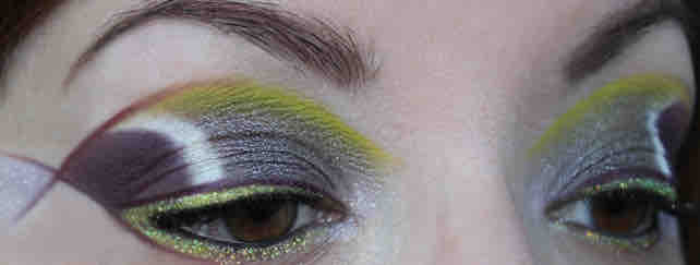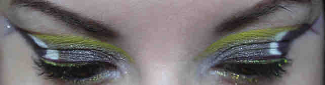 Nun denn, in medias res: auf der Grundierung hab ich als erstes mit einem abgeschrägten Linerpinsel und True Chartreuse eine Linie entlang des Brauenbeins angezeichnet, allerdings nur etwa drei Viertel der Länge des Auges. Dann mit einem anderen Pinsel ein wenig mehr True Chartreuse aufgenommen, und unter dieser Linie verblendet. Das Ende der Linie vorn zur Nase hin ist aber nach wie vor relativ definiert zu sehen.