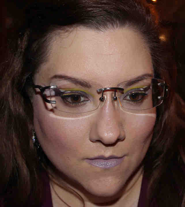 Das hatte ich noch bei Tageslicht fotografiert, nachdem ich mit dem Schminken komplett fertig war, hatte ich aber leider überhaupt keine Zeit mehr um mein Gesicht zu fotografieren, sodaß ich das blöderweise erst ca. vier Stunden später tun konnte. Da war das Tageslicht leider weg, und das Makeup natürlich auch nicht mehr taufrisch, aber ging halt zeitlich nicht anders. Lediglich der Lippenstift ist aufgefrischt. Pudern hätte ich allerdings auch mal sollen, wie sich gezeigt hat…