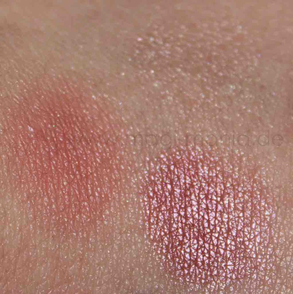 An dem Blush mag ich nicht, dass es sich so anfühlt wie Hände mit Kreide und dann reiben. e sofort Gänsehaut. Außerdem blieb immer nur die Hälfte auf der Haut – der Rest musste als Kügelchen weggefegt werden. Dafür ist es schön seidig, das stimmt. Macht bestimmt einen tollen Übergang, aber ich mag es nciht, wenn das Zeug sich wie hier in z.B. den Poren sammelt und daviel intensiver ausseiht als auf den Flächen selbst. Zu transparent – zu viel Medium. Näh. Obwohl die Farben anders als auf dem Promobild aussehen, fand ich sie live noch viel schöner, aber einfach nicht mein Fall. Kriege beim Gedanken daran immernoch Gänsehaut XD