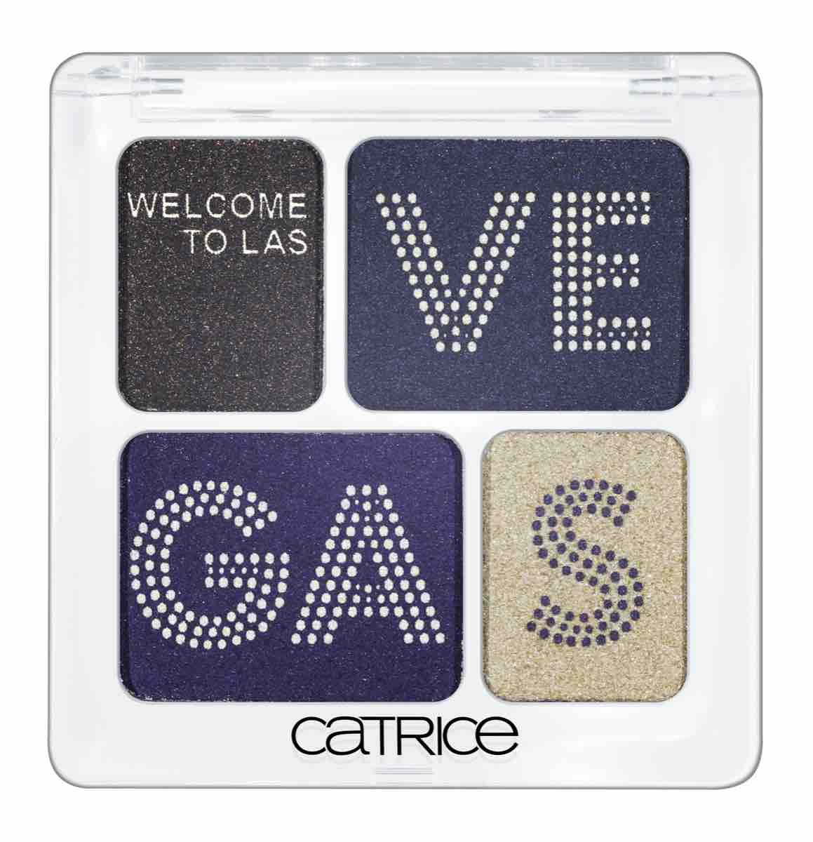 CATRICE Welcome to Las Vegas – Der Name könnte einigen Glitter und Regenbogenfarben versprechen, jedoch ist die Kollektion eher schlicht und dunkel gehalten. Neben einem Lidschatten-Quad und Fake Lashes gibt es eines mit Print versehenes Puder und ein Shimmer-Ppuder mit Zerstäuber.