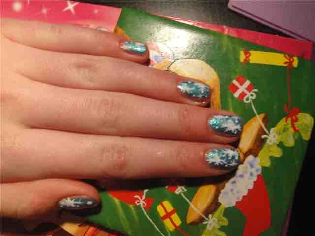 Ich mag das Flöckchendesign. Das sieht einfach klasse aus mit den Schneeflocken auf dem dunkelblauen Lack 🙂