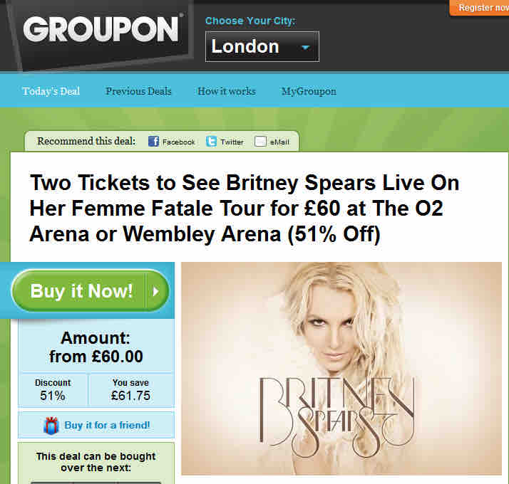 Nicht lachen: ich habe auch die GROUPON-Deals für London abonniert – man weiß ja nie. Heute im Newsletter: 2 für 1 für ein Britney Spears Konzert. Vielleicht plant ihr ja eh nen Kurzurlaub dahin… Nur noch bis Mitternacht Londoner Zeit!