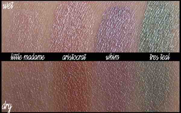 Die Lidschatten, wie sie in dieser Kollektion erhältlich waren, kamen nie wieder – weder von der Textur noch vom Effekt. Deutlich feiner gemahlen erzielten sie einen sehr dezenten, teilweise changierenden Perlglanz, der sich eigentlich nicht all zu sehr von gewöhnlichen Lidschatten unterschied – die späteren MES waren deutlich metallischer und strahlender – aber auch gröber und widerspenstiger. Ich vermute, man hatte sie viel mehr auf die wet-Anwendung ausgelegt. Erst jetzt mit der Semi-Precious fühlte ich mich ein wenig erinnert an