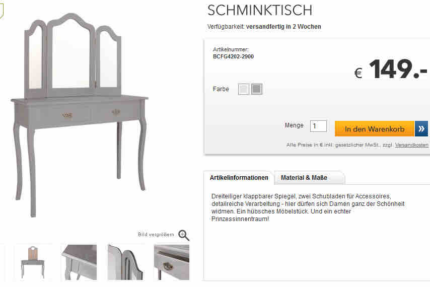 Ein Vanity – romantischer Schminktisch mit Spiegel für 149,-€ bzw. abzüglich des Gutscheins netto 129,-€: