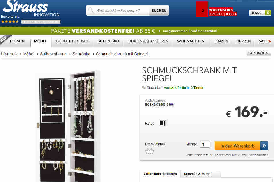 Gerade für mich sehr spannend – leider ohne Bild mit geschlossener Tür – ein Schmuckschränkchen für 169,- bzw. 149,- abzüglich des Gutscheins: