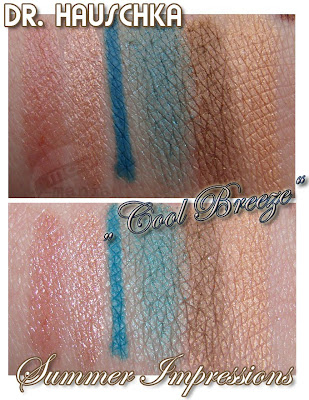 Es gibt zwei Paletten mit allem, was nötig ist für einen abgerundeten Look. In verschiedenen Farbzusammenstellungen kann man für 30,00€ 3 Lidschatten, zwei Lippenfarben und einen Minikajal in passender Nuance. Dazu jeweils passend zum Typ ein Bronzerduo (Splitpan) für jeweils 24,00€ und Bronzig-Fluid für helle und mittlere Typen für einen bronzigen Glow für 17,00€.