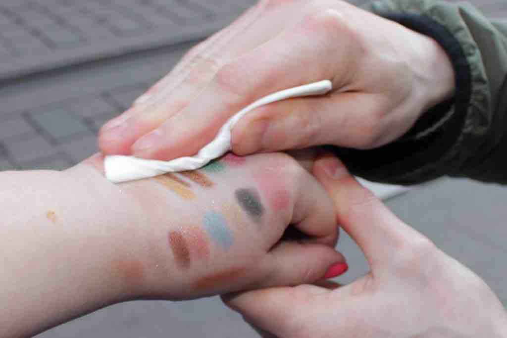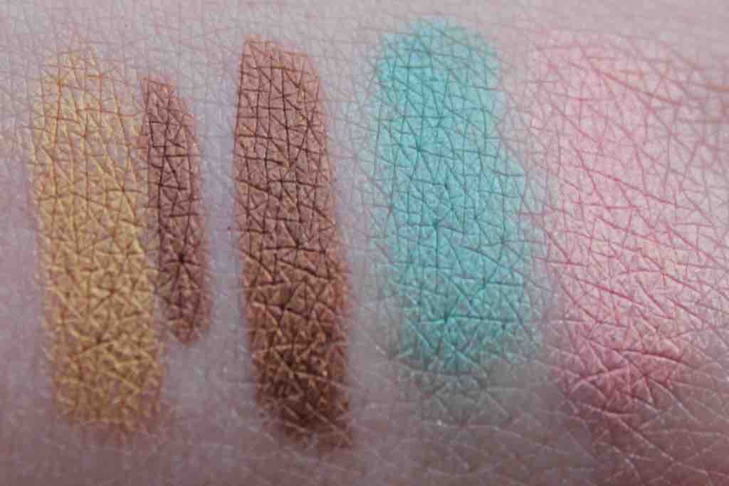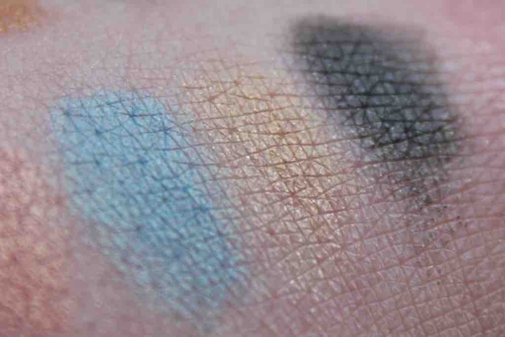 Alle Blicke lenkt natürlich die Palette auf sich, die mir besser gefiel als erwartet – nicht zuletzt, weil sie einen Schwachpunkt-Lidschatten enthält: Off-Black mit Goldschimmer. Aber auch die anderen Farben sehen in der Kombination einfach sehr verlockend aus. Man muss wohl abchecken, ob man solche Farben nicht schon besitzt, aber die schlichte Anordnung ist für mich definitiv ein Pluspunkt. Die Swatches alle mit Fingerkuppe ohne Base auf dem Handrücken.