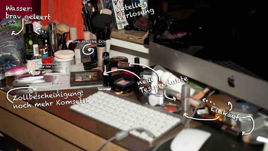 Mein Schreibtisch sieht genauso chaotisch aus, nur dass da keine Kosmetik steht, sondern irgendwelcher Papierkram, den ich noch nicht verräumt oder weggeschmissen habe. Meine Kosmetik ist recht ordentlich im Bad verstaut.