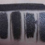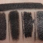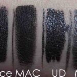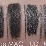 unter verschiedenen Lichtverhältnissen – unten rechts MAC ‚Blacktrack‘ als klares Schwarz