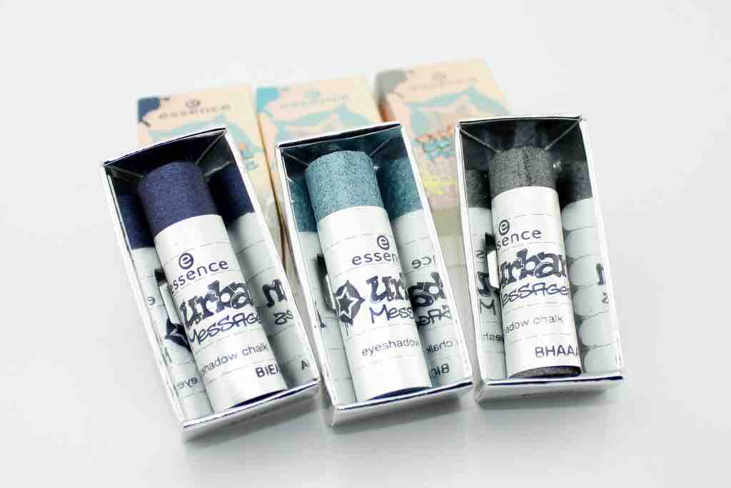 Ungewöhnliche Neuheiten machen mich stets neugierig und im Falle der Eyeshadow Chalks aus der URBAN MESSAGES Kollektion von Essence, die in Zusammenarbeit mit FRAG DIE GURUS entstand, besonders. Denn ich habe einen Stift von Jemma Kidd, der sich wie ein Creme-Lidschatten-Stift herausdrehen lässt, aber pudrig ist, dessen Umsetzung mir unheimlich gut gefällt. Auf so etwas hoffte ich auch hier – und liege zumindest von der Textur her nicht ganz falsch.