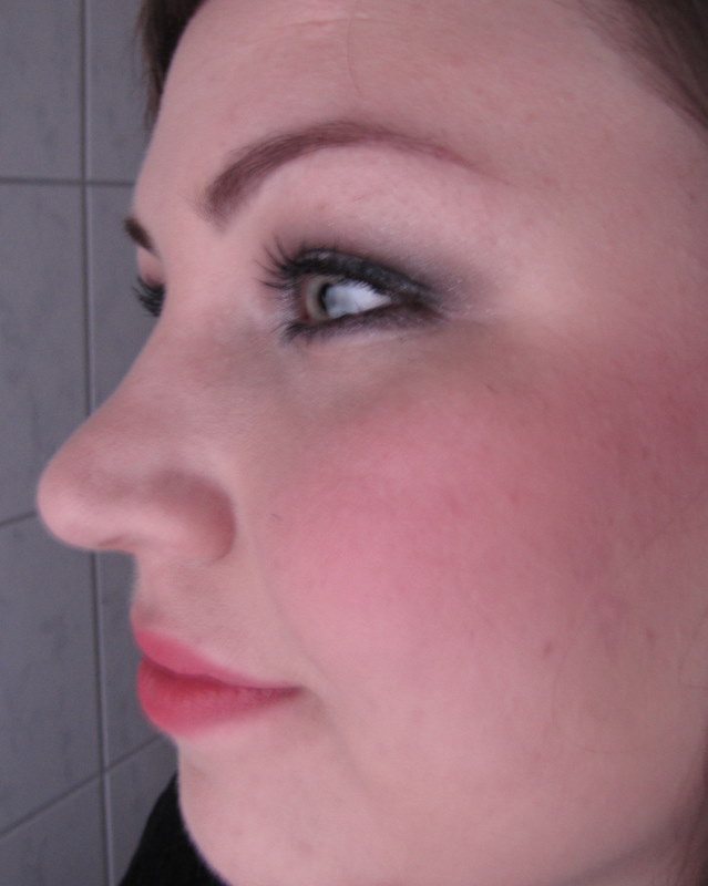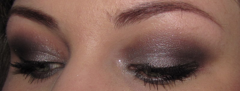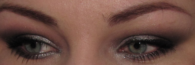 Der silberne Lidschatten ist leider qualitativ dem Preis entsprechend – er wirkt sehr grob und mehlig trotz Schimmer auf dem Lid. Knapp gesagt „augesetzt“ statt mit der Haut „verschmolzen“. Der fast schwarze Lidschatten, der hier in die Lidfalte mit dem MAC 217 eingearbeitet wurde, war aber wirklich das Highlight. Ich betone den Pinsel explizit, weil ich mir sicher bin, dass er für die sanften Übergänge mitverantwortlich ist. Die Stärke des Lidschattens kommt aber eher im direkten Licht, z.B. Lampen zum Tragen, was hier bei mauschigem Wintertageslicht leider völlig untergegangen war, nämlich die Schimmerpartikel. Die funkelten schon sehr – das aber gleichmäßig und Dank goldener Schattierung gar nicht so ramschig. Wer z.B. bei NARS Night Series Lidschatten vom Mangel der im Pott sichtbaren Funkelstücken enttäuscht war, wird es hier definitiv nicht sein. Aber es ist doch etwas gröber als die Partikel höherpreisiger Lidschatten. Das muss man mögen, aber ihr seht ja vor Ort, um welchen Grad es sich handelt. Ich bin kein Funkel-Fan, aber zu manchen Anlässen finde ich es doch willkommen. (sorry für den Eyeliner-Patzer!)