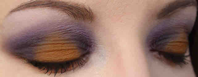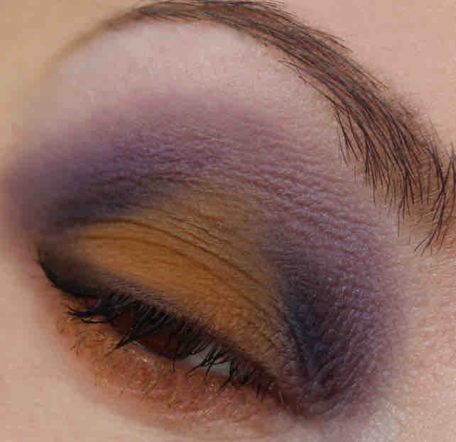 Denn auf den kommt dann das satte, okkerfarbene Toffee von Ben Nye. Zu den Seiten hin mehr getupft als geblendet, denn wenn es sich zu sehr mit kühleren Farben mischt, entsteht schnell ein schmutzig grüner Mischton (Ben Nye Bark hatte ich allein aus diesem Grund aufgetragen, damit das Okker sich eben nicht direkt mit dem Lila mischt, denn dann ist dieser Vergrünungseffekt kaum aufzuhalten).