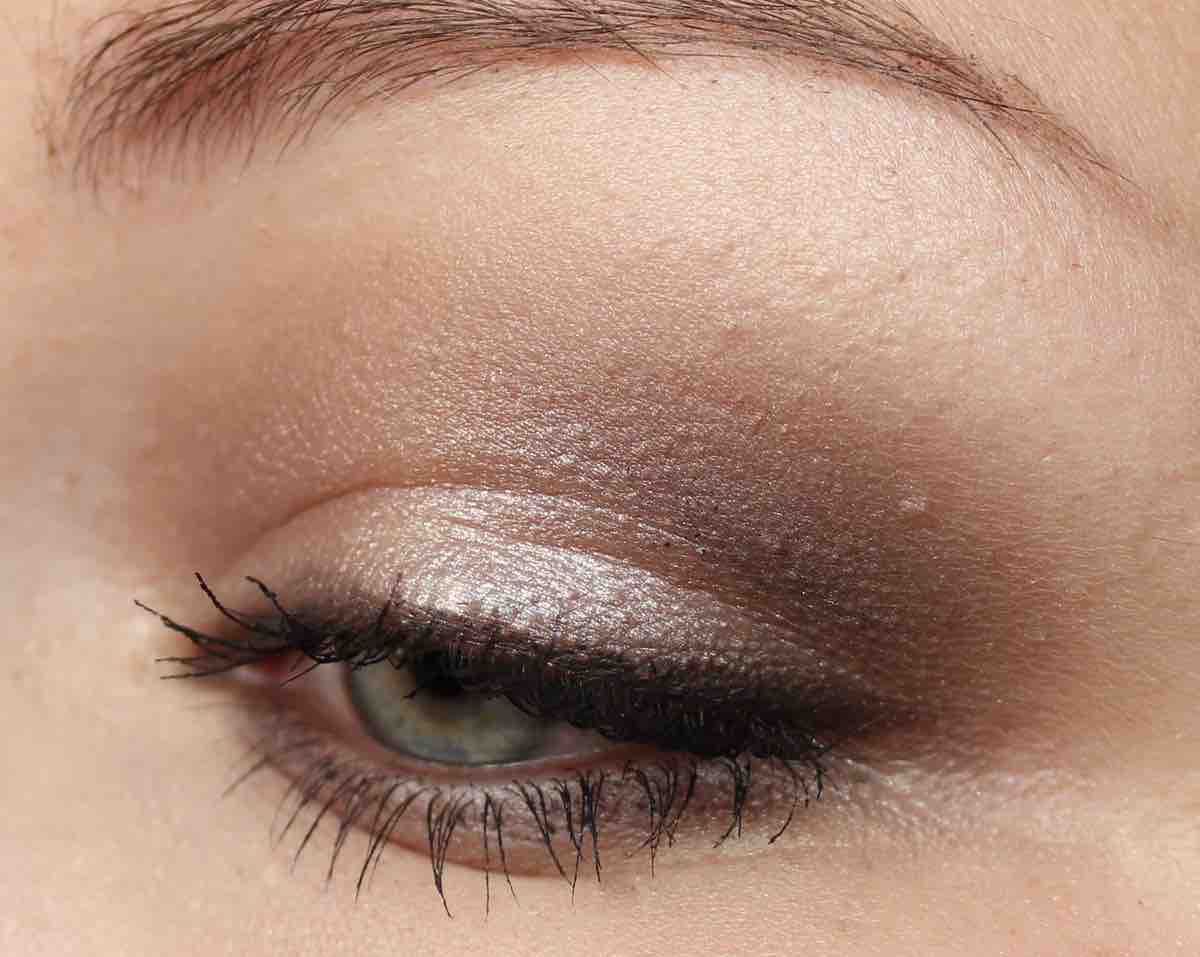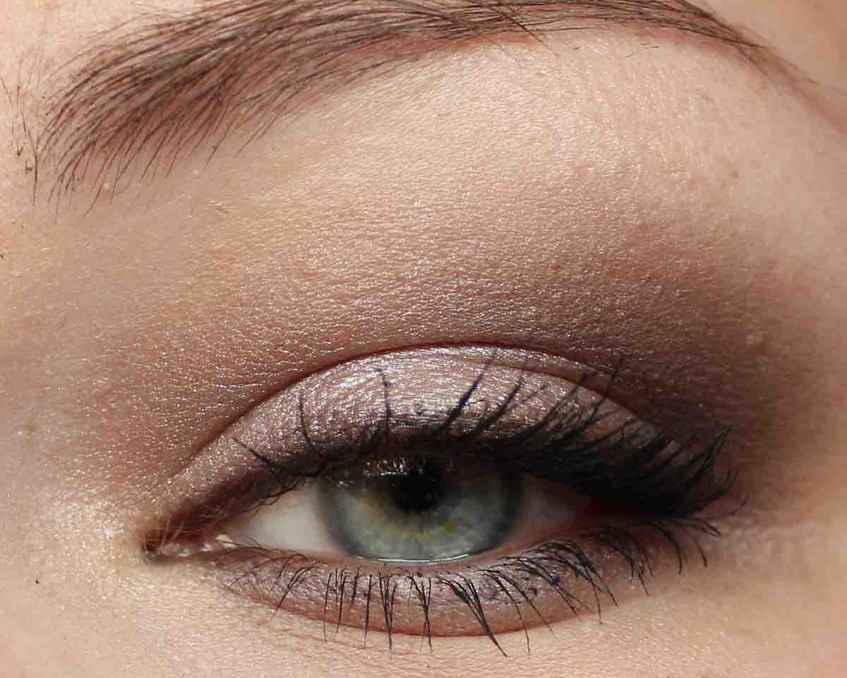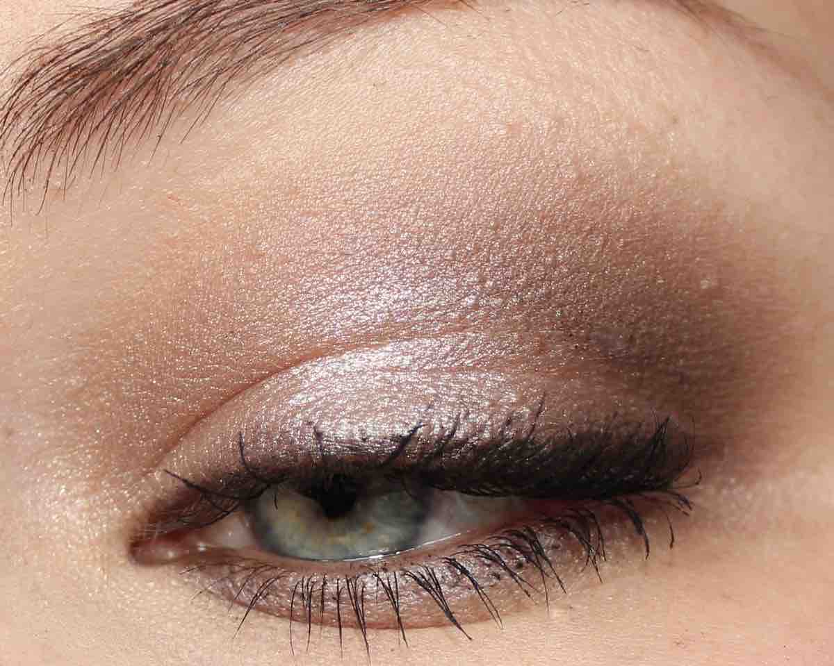 - den leicht schimmernden, dunkleren Taupe-Ton links in der Palette mit einem präzisen aber fluffigen Pinsel in die Lidfalte und auf dem unteren Lid