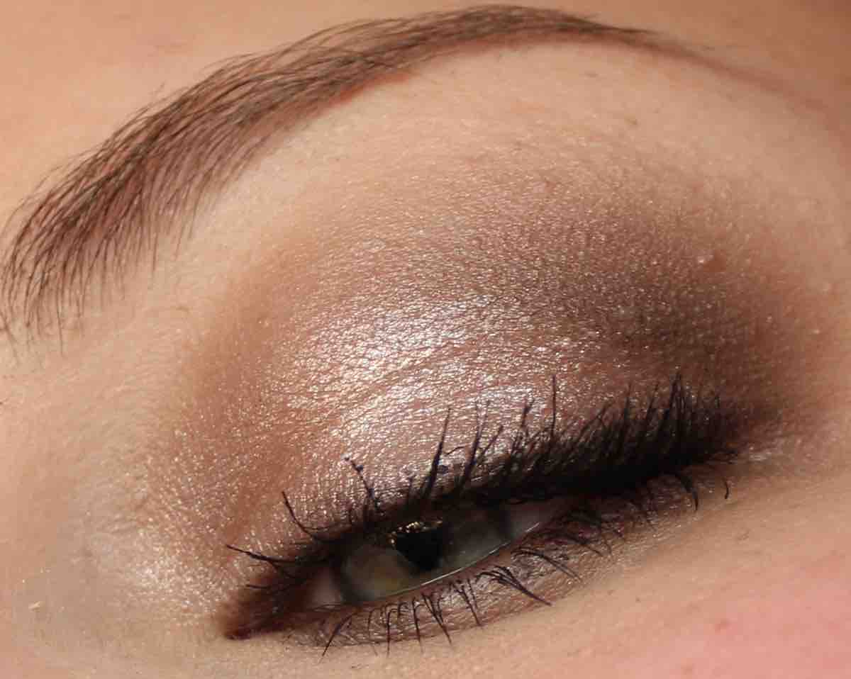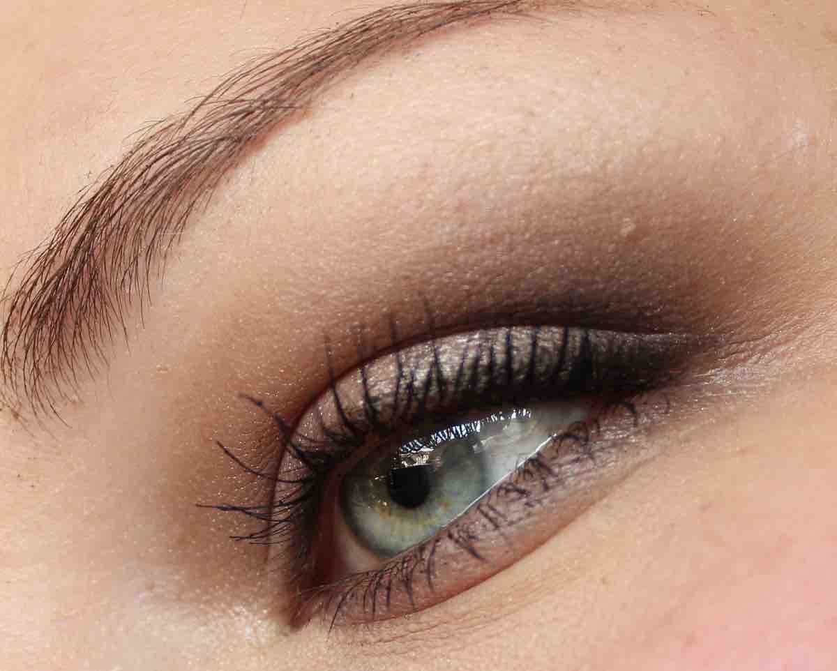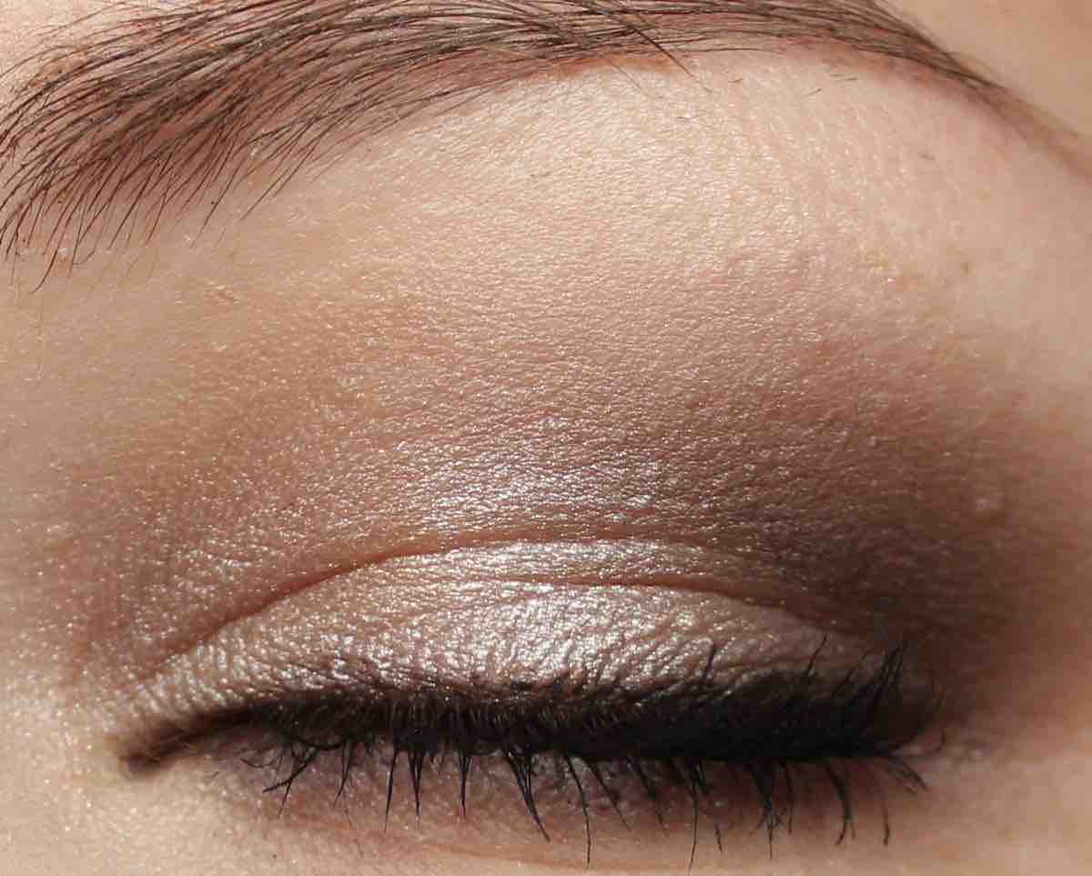 - den leicht schimmernden, dunkleren Taupe-Ton links in der Palette mit einem präzisen aber fluffigen Pinsel in die Lidfalte und auf dem unteren Lid