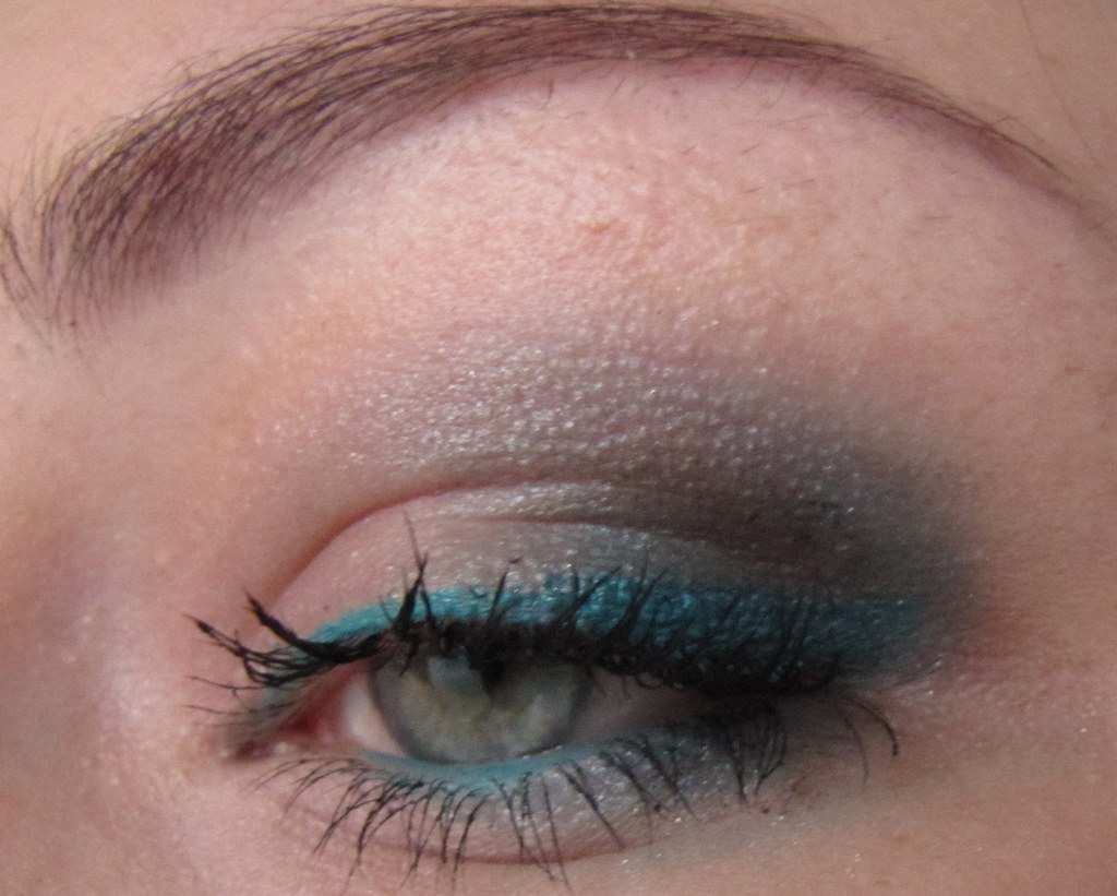 Ich habe mich blind für diesen Teal-Ton entschieden, der mir in natura unheimlich gut gefällt, weil er eine ausgewogene Mischung von Blau und Grün hat – meist findet man ja eher Cyan-Blau bei solchen Produkten. Ich habe eine große Sammlung an MAC Fluidline Gel Eyelinern, die MAC aber drastisch auf Basics reduziert hat. Es bleiben einem da wohl nur die Chromaline. Mir gefällt so weit die Textur von INGLOT aber besser. Sie ist eher wie die der Fluidline, etwas kremiger als ich die Chromaline erlebt habe (habe meine abgegeben). Die Deckkraft ist gut und das Produkt lässt sich streifenfrei auftragen (mit etwas Mühe – die Fotos enthüllen immer Lücken, die mir im Spiegel gar nicht aufgefallen sind), aber bei kremigen Gel-Eyelinern ist das ja selten das Problem – die schimmrigen sind ja oftmals die Bösen. Aber einen guten Eyeliner, auch farbig, für den Wimpernkranz zu finden, ist heutzutage ja nicht mehr sooo schwer. Sei es, dass man Lidschatten mit Medium appliziert.