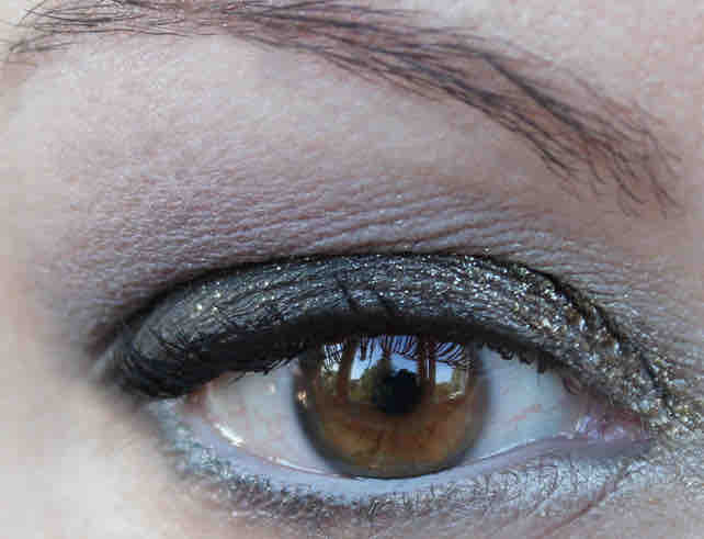 Der Glitzer ist optional, aber da ich es mag, wenns glitzert, nehme ich ihn schon meistens dazu… Hierzu hab ich bissl Ben Nye Final Seal auf das innere Drittel des Auges getupft, und dann MAC Reflects Glitter Antique Gold drauf gegeben. Den gleichen Glitter also, den ich auch für meine warm braunen smokey eyes verwende, aber wie ich schon oft erwähnte – er ist sehr, sehr variabel, und macht sich zu beiden Varianten reizvoll, wie ich finde. Den Wimpernkranz hab ich anschließend mit Ben Nye Black erneut ein wenig schwarz betont.