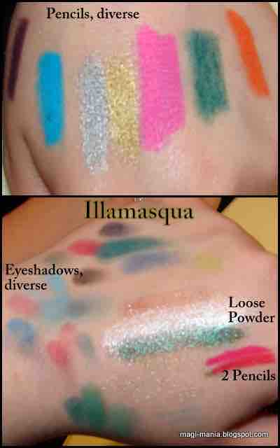 Inzwischen bereue ich keinen Pencil mitgenommen zu haben. Alle Stifte von ILLAMASQUA dienen sowohl als Lip- als auch Eyeliner und sind in allen Farben des Regenbogens erhältlich. Sie decken perfekt im Auftrag, siehe den Swatch auf der Hand der Makeup Artist links. Auf meiner Hand (unten) gibt es eine kleine Impression bezüglich der losen Lidschattenpuder – sie sind sehr schimmrig und gleiten wie Öl über die Haut. Sie ließen mich allerdings etwas kalt.