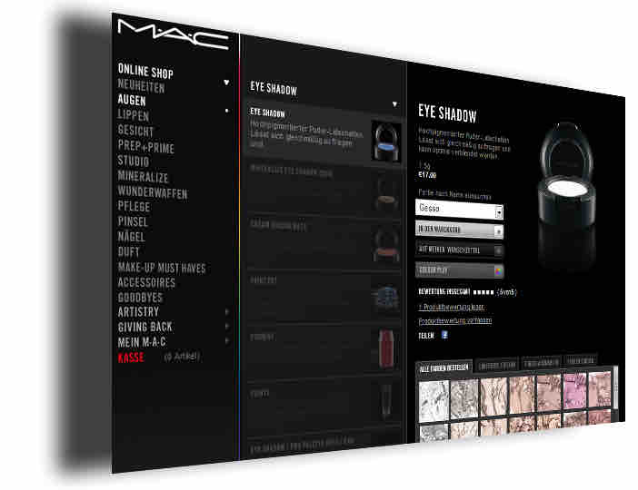- Die Menüführung gestattet ein ganz simples, intuitives Durchstöbern und Vergleichen der M·A·C Produktpalette mit ihren tausend Variationsmöglichkeiten. Durch das dreiteilige Layout können User sich parallel die Details eines spezifischen Produktes anschauen, andere Produkte derselben Kategorie und die komplette Liste sämtlicher Produktkategorien aufrufen.