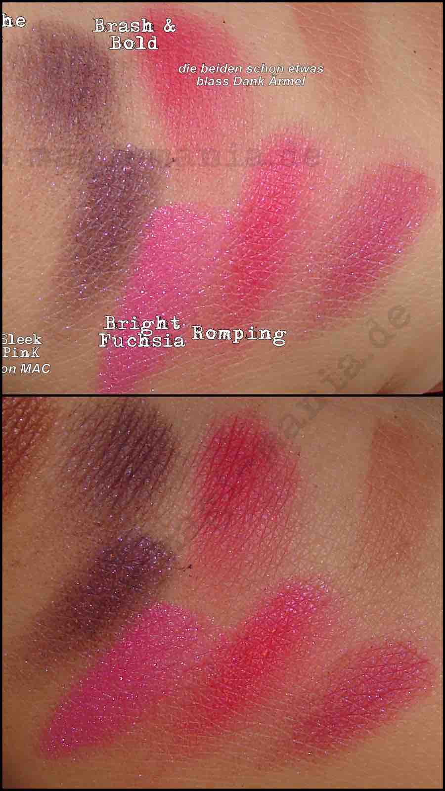 Leider, leider ist der Swatch etwas wenig aussagekräftig, aber ich führte die neuen Pigments BRASH & BOLD sowie PUSH THE EDGE mehrere Stunden durch die Stadt, zum Essen etc. sodass sie bereits etwas vom Ärmel verwischt wurden. Dennoch erkennt man durchaus, dass die Ähnlichkeit zum PRO Pigment GRAPE und dem pinken BRIGHT FUCHSIA nicht von der Hand zu weisen sind. Ich bin mir sicher, es kursieren noch mehr Swatches im Netz. Wer die genannten Piggies bereits hat, braucht aus meiner Sicht nicht unbedingt die beiden neuen – wer allerdings nicht die Möglichkeit hat ihn einem der PRO Stores einzukaufen, sollte bei den schönen Farben zuschlagen.