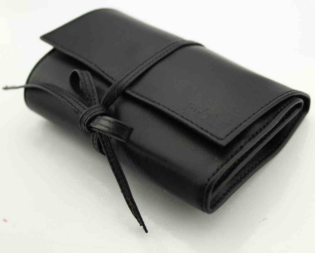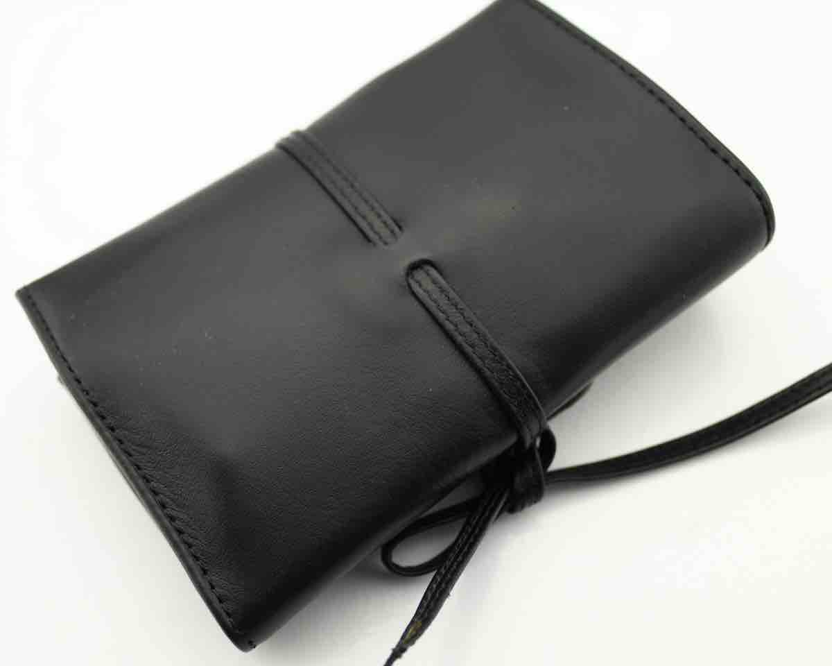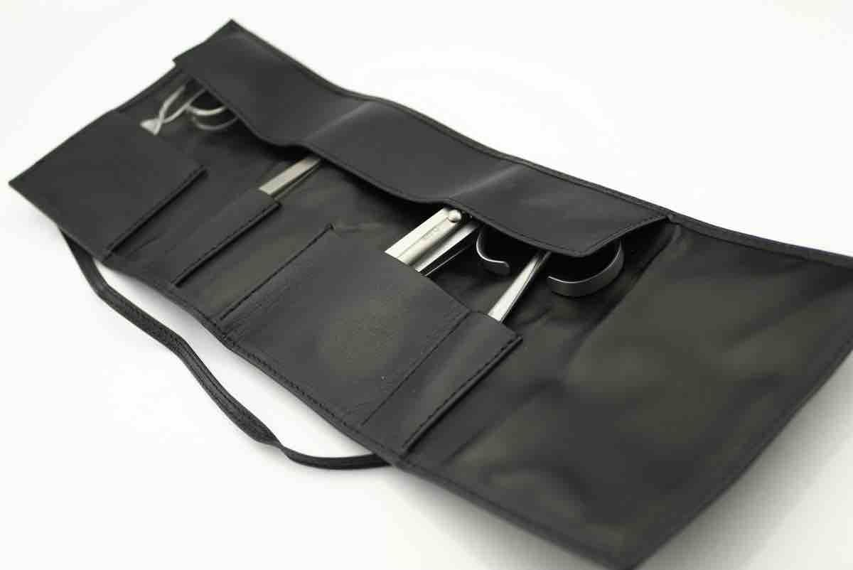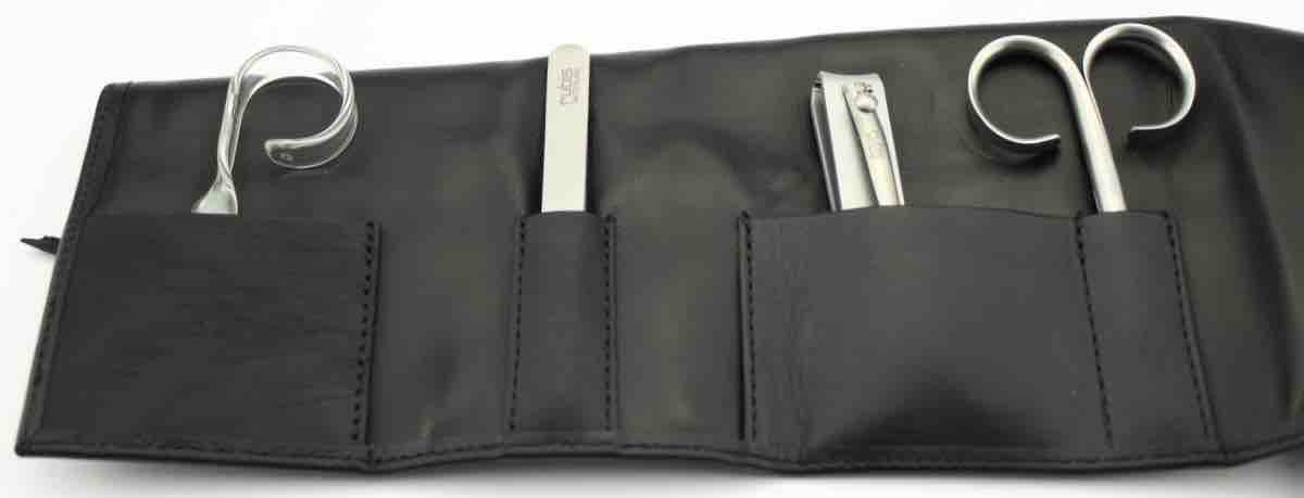 Desweiteren birgt das Kit eine geformte Glasnagelfeile, einen Knipser sowie eine Nagelschere. Das Ganze befindet sich in einem Lederetui zum Zubinden.