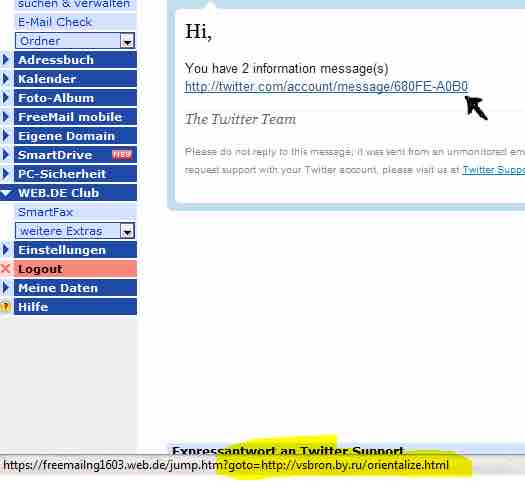 OK, etwas fremd hier, aber ich halte es als Twitter-Addict (inzwischen) für wichtig zu warnen, dass in der Tat (ich bin ja so naiv) als TWITTER-Systemmails getarnte Emails kursieren.