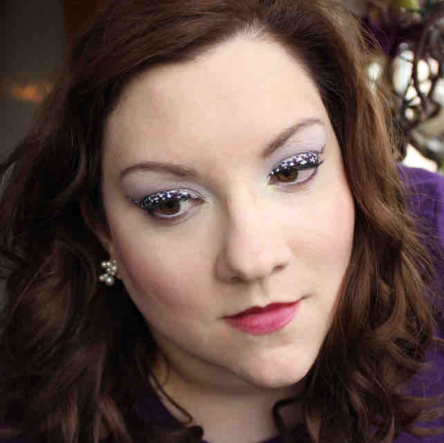 Das Makeup – als erstes hab ich auf das bewegliche Lid, die Crease und auch ein wenig darüberhinaus ganz zart Ben Nye White gegeben. Dann ebenfalls relativ vorsichtig und schön weich die Lidfalte mit Ben Nye Violeta schattiert. Am unteren Lid ist ebenfalls ein wenig Violeta, aber nur ungefähr auf halber Strecke, und auch nur nah am Wimpernkranz. Unter den Brauenbogen und in den Innenwinkel kam Chrystal Avalanche von MAC. Anschließend bin ich mit MAC Vellum, der ja lediglich leicht lila changiert, ansonsten aber keinerlei farbliches Eigenleben führt, über das ganze AMU drüber gegangen, und zwar komplett vom Wimpernkranz bis zur Braue.