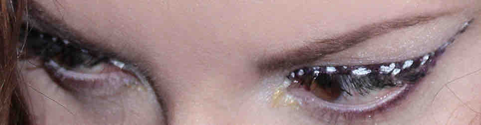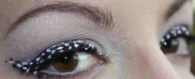 Im einzelnen bin ich folgendermaßen vorgegangen: zuerst hab ich mit Macroviolet (weil das die dunkelste Nuance ist) einen relativ breiten, auffallenden Lidstrich gemacht; der aber keineswegs ordentlich sein muß, denn man sieht am Ende ja nicht mehr viel davon. Ich hab Macroviolet außerdem auch ans äußere Drittel des unteren Wimpernkranzes gegeben. Dann hab ich mit Scribe weiße Flecken auf diesen Lidstrich gemalt. Das Coole ist, daß auch diese Flecken mitnichten irgendwie egal kreisrund o.ä. sein müssen, denn der Look lebt ja gerade von der Unregelmäßigkeit… Wenn man wollte, könnte man es auch einfach hierbei schon belassen; auch das sieht schon echt toll aus, allerdings ist der Lidstrich in diesem Stadium optisch natürlich schon noch ziemlich präsent, sodaß er ggf. dann doch ordentlich gemacht sein müßte. Nungut, nach den weißen Speckles hab ich mit Aubergine einige Tupfen auf das Ganze drauf gesetzt, und zuletzt mit Ultra Violet. Der Kontur des grundierenden Lidstrichs dabei zwar in etwa folgend, aber ein wenig darüber hinaus, sodaß nicht mehr zu sehen ist, wo er eigentlich genau verläuft.