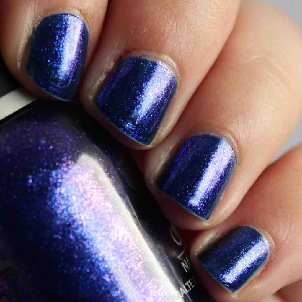 Das Schöne ist, wie ich finde, dass man sie sowohl als Topper über Wunschfarben nutzen kann, da das Medium an sich nicht all zu deckend ist, aber in 2-3 Schichten trotzdem blickdicht bekommt. Die Effekte lassen sich den Lacken nicht gerecht einfangen, denn die vom Licht gebrochenen Nuancen wie hier das Pink sind definitiv dominanter. Hinzu kommt eine Reflektion, die nicht einmal direktes Licht benötigt, um herauszustechen. ‚Lunar Eclipse‘ wirkt bei jedem Licht wie blaue Metallfolie. Dezent it anders…