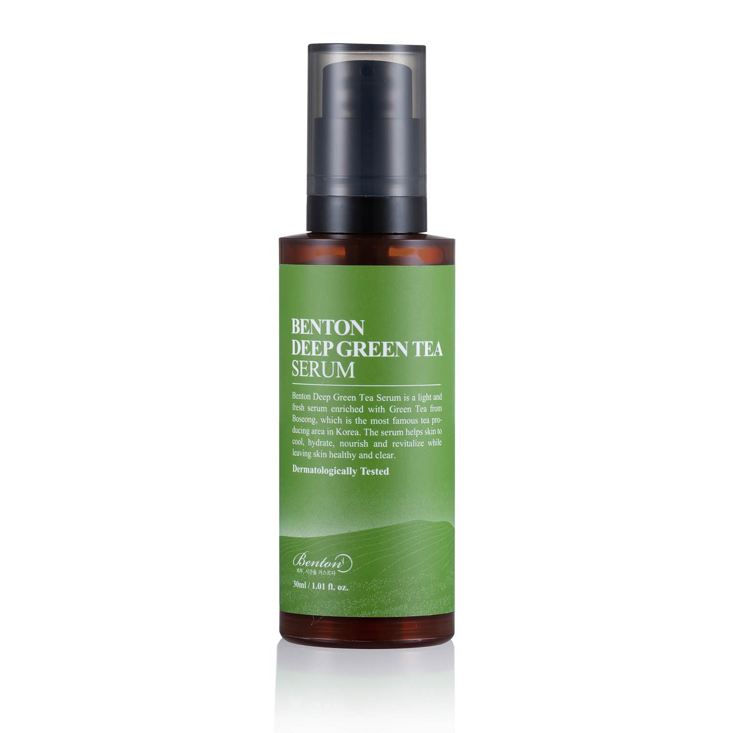 Das BENTON Deep Green Tea Serum mit Grüntee gegen Hautreizungen und Entzündungen. Centella Asiatica (Tigergras) und Houttuynia Cordata wirken antioxidativ, boosten die Haut und spenden viel Feuchtigkeit. Das Serum dringt tief in die Haut ein und versorgt die Haut dort nachhaltig mit Feuchtigkeit und Aktivstoffen.