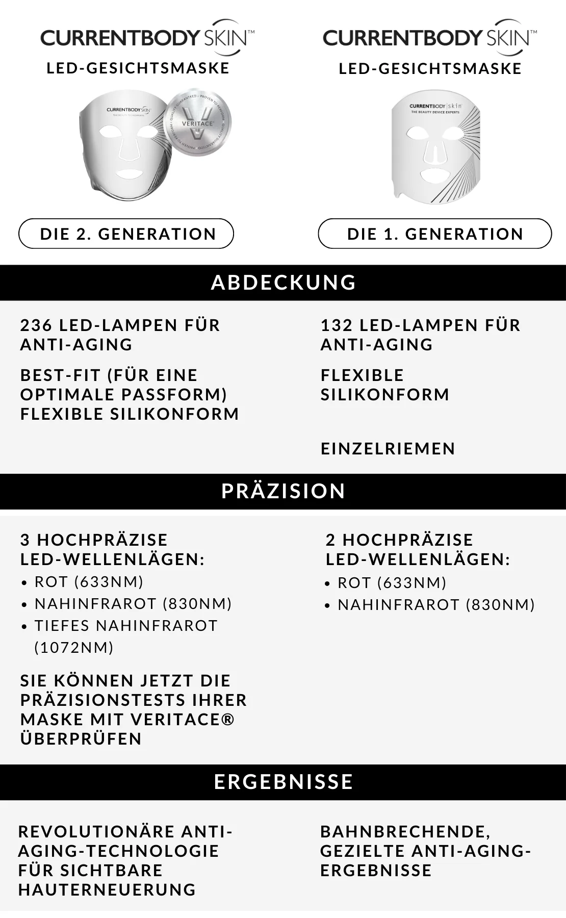 Die CURRENTBODY LED Maske zur Anti-Aging-Lichttherapie in Version 2 setzt rotes Licht mit einer nachweislich wirksamen Wellenlänge von 633 nm zur Stimulation der Elastin- & Kollagensynthese ein. Die Spannkraft der Haut soll verbessert und Fältchen reduziert werden. Nahinfrarot in zwei unterschiedlichen Wellenlängen (830 & 1072 nm) wirkt antientzündlich und regeneretionsfördernd.