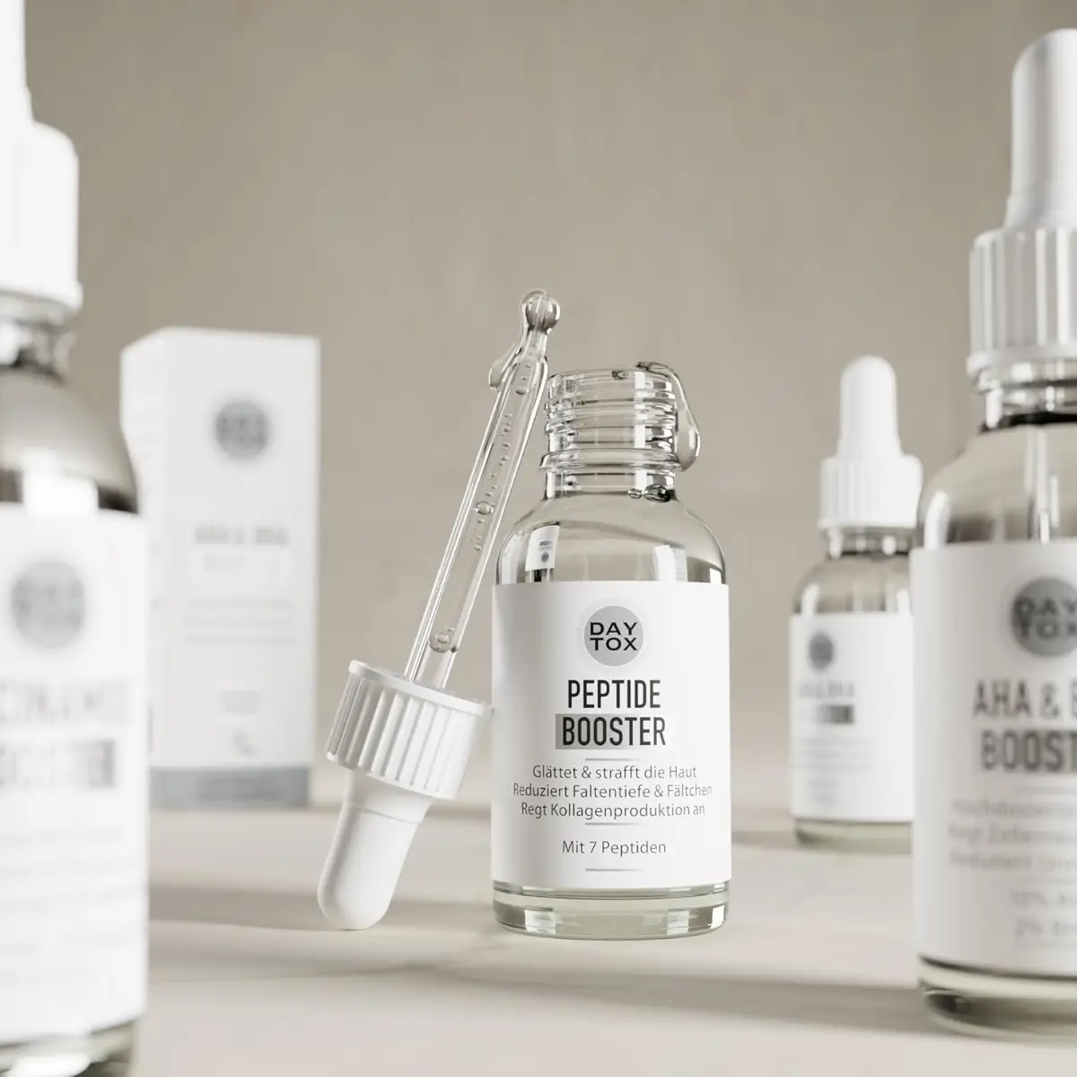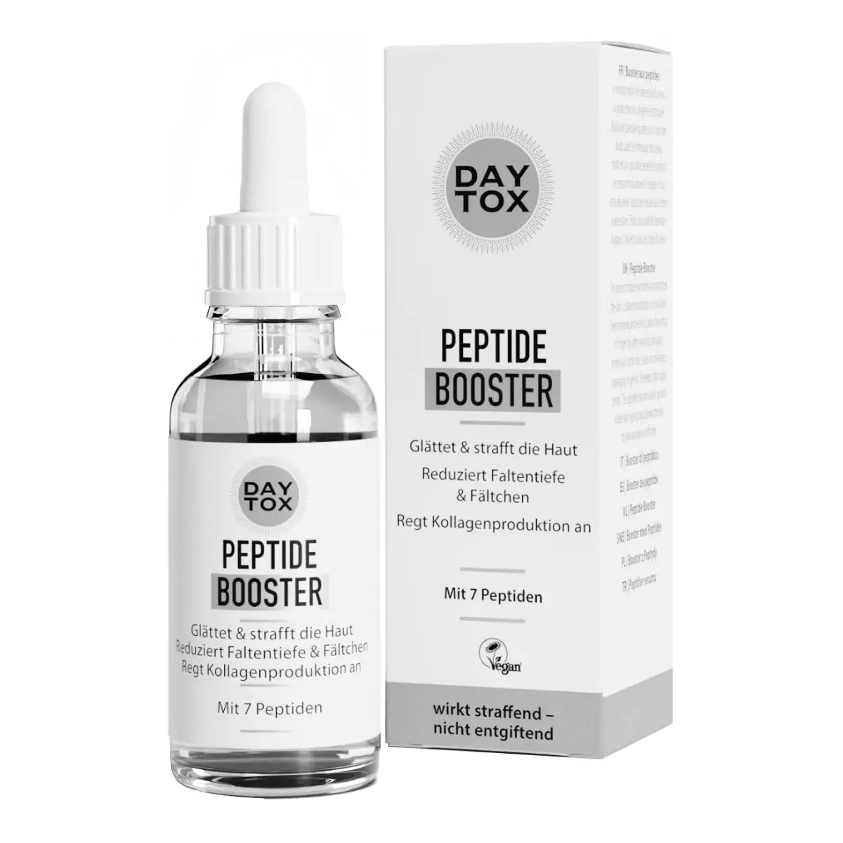Der DAYTOX Peptide Booster ist ein dünnflüssiges Serum mit einem Peptid-Komplex, das die Haut bei der Regeneration unterstützt. Davon kann auch Kollagen profitieren und so langfristig angewendet feine Linien glatter erscheinen lassen und das Hautbild angleichen.