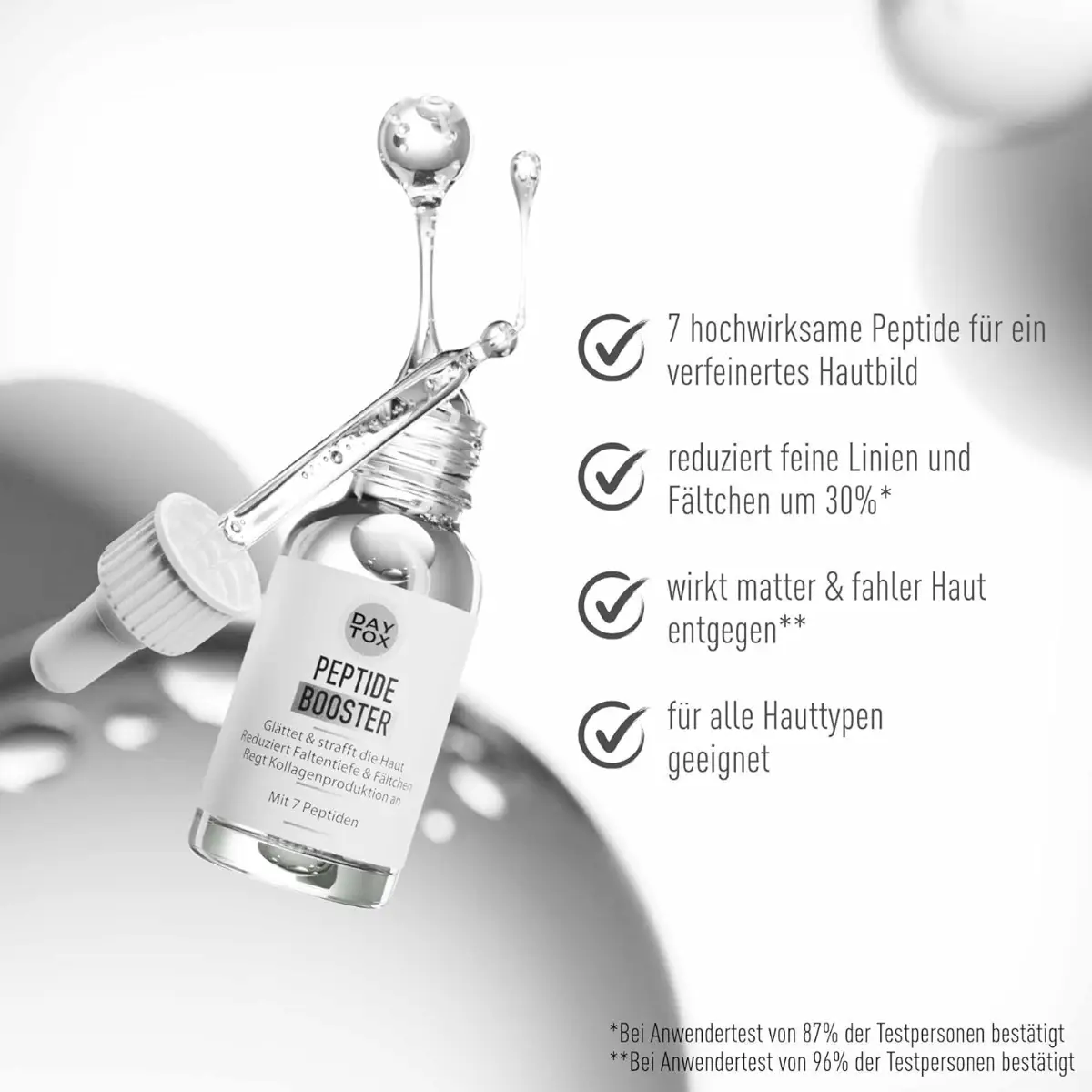 Ein Boost für mehr Wirksamkeit in deiner Pflegeroutine: In unserem Peptide Booster haben wir gleich 7 hochwirksame Peptide eingearbeitet. Die enthaltenen Peptide verbessern das Erscheinungsbild der Haut und reduzieren leichte Linien und Fältchen um 30%. Der Booster mildert außerdem die Faltentiefe. In einem Anwendertest bestätigten 87% der Testpersonen, dass der Peptide Booster außerdem die Faltentiefe mildert. Auch die Kollagenproduktion der Haut wird angeregt. Dank des umfassenden Anti-Aging-Effekts des Peptide Boosters wirkt die Haut jünger und straffer.