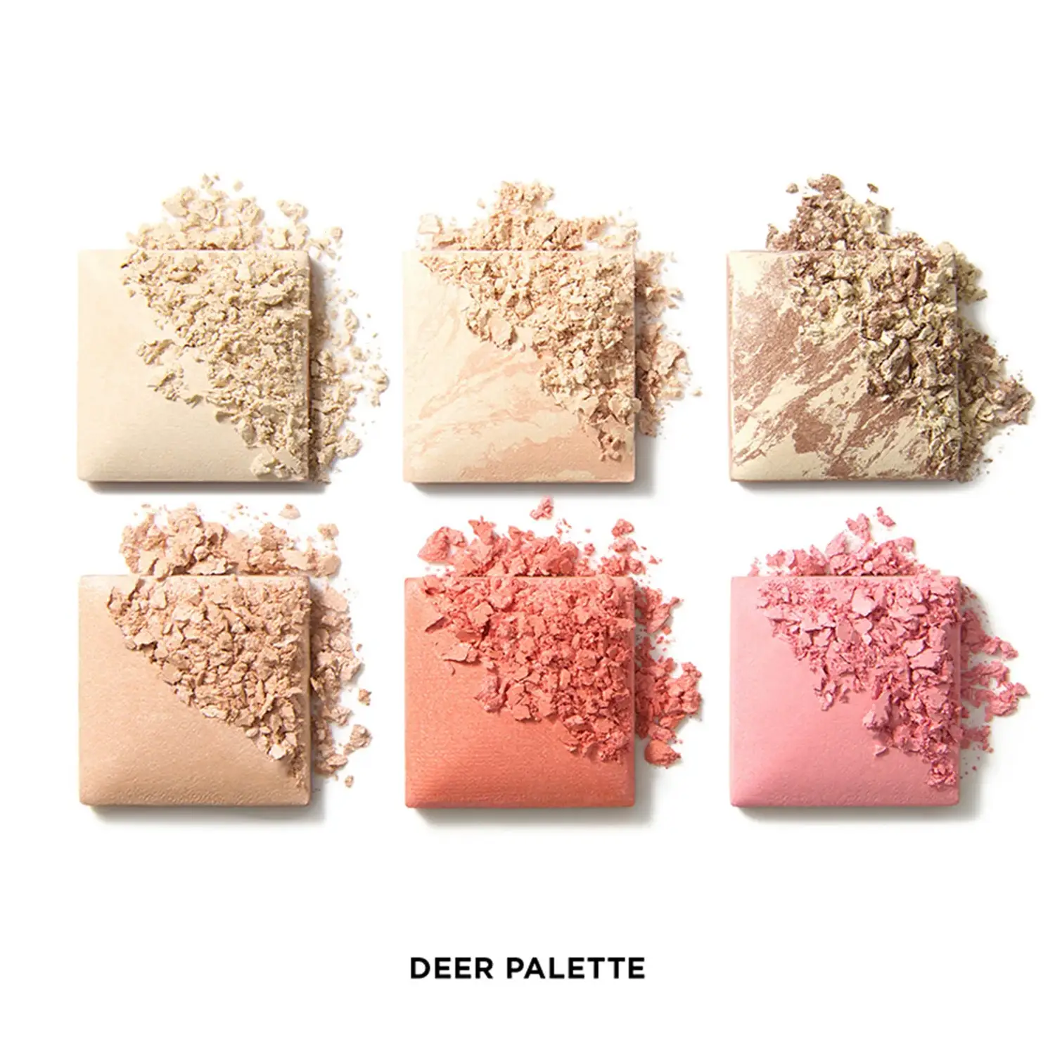 - DEER: Featuring exclusive deer artwork in Sasha’s signature watercolor style, this palette includes one bestselling finishing powder, highlighter, and bronzer, as well as three new shades of blush and finishing powder to diffuse, enhance, and add glow to the complexion.