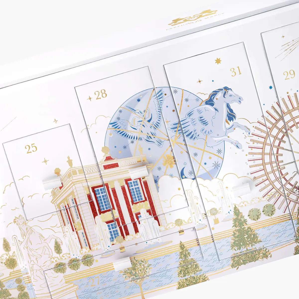 Zum neuen Jahr überreichte der Sonnenkönig gerne kostbare Geschenke. Dieser Tradition folgend lädt Parfums de Marly Sie zu einem magischen Schauspiel ohnegleichen ein. Dieser Vorfreude-Kalender überrascht mit 12 Geschenken in 7 Schubladen und offenbart dabei eine zauberhafte Welt, in der jede Entdeckung ein Staunen hervorruft. Denn um das Anwesen zum Leben zu erwecken und zu beleuchten, wird eine ganze Reihe von Ereignissen in Gang gesetzt – vom berühmten Himmelsglobus von Coronelli, der in einem der zwölf Pavillons untergebracht ist, bis hin zur Maschine von Marly.