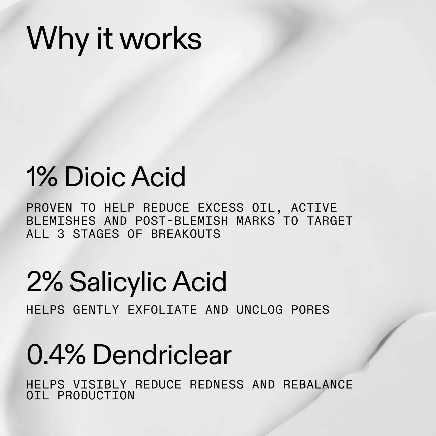 Formulated with 1% Dioic Acid to visibly reduce blemishes and pigmentation, 2% Salicylic Acid to unclog pores, and 0.4% Dendriclear to balance oil. This multi-action skin clearing serum blend helps leave skin visibly clearer, calmer, and balanced.