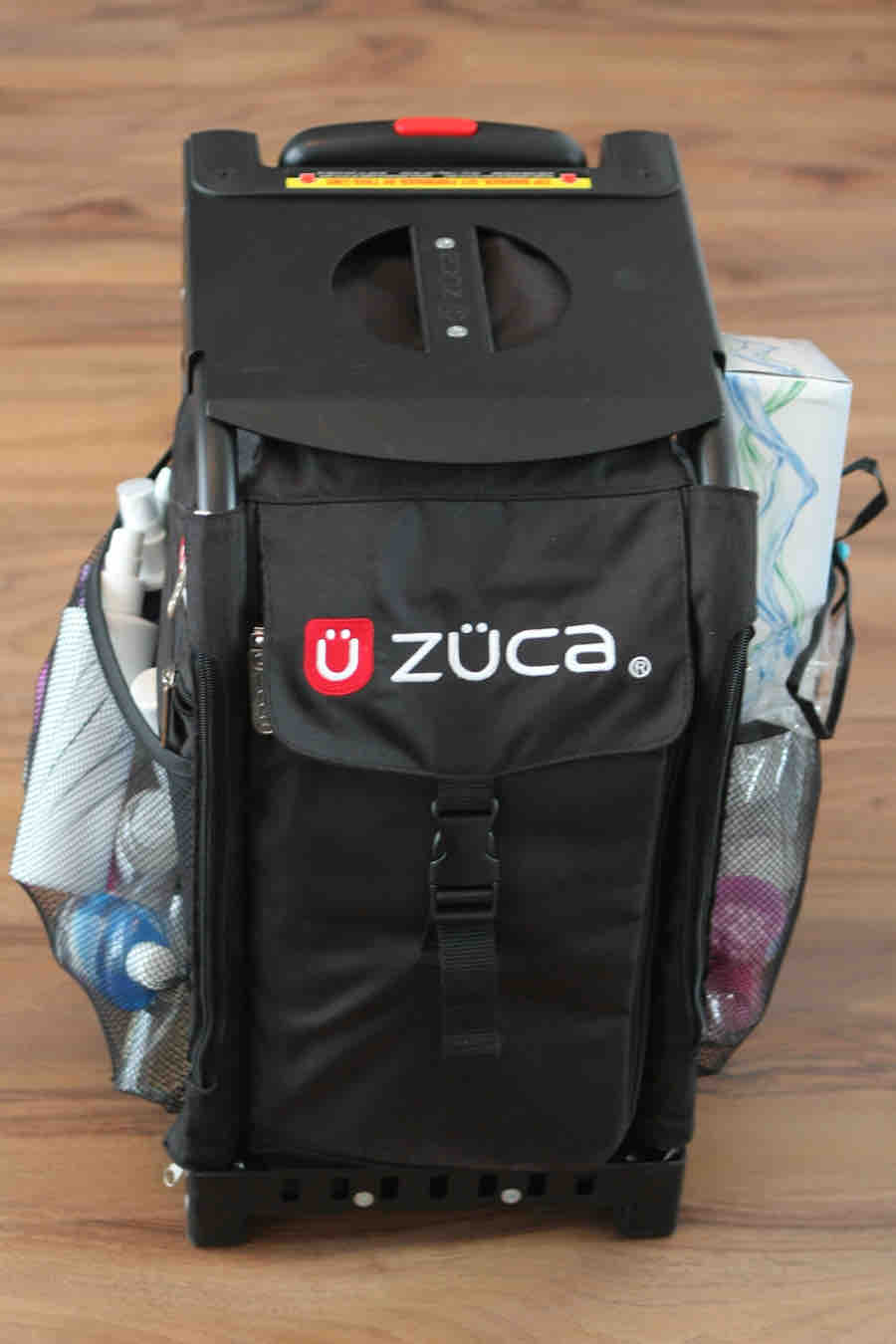 Außerdem haben die Zucas viiiiiele eingebaute Taschen, sowohl außen als auch innen. Dort wohnen meine Pinsel in dem Pinselbecher (und weitere, seltener benutzte Pinsel in meinem Pinselgürtel), Desinfektionsmittel für meine Hände, Oberflächen, Pinsel und für das Makeup, Papiertücher, Wattestäbchen etc. etc.