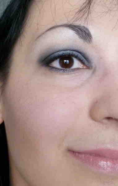 Als Grundierung habe ich Paintpot Blackground verwendet. Dann habe ich als Highlighter Mylar aufgetragen, gefolgt von Print in der Lidfalte und ausgeblendet. War mir nicht dunkel genug, also habe ich noch Typographic zum Abdunkeln genommen. Print und Typographic habe ich dann mit ein ganz klein wenig Crystal Avalanche ausgeblendet. Auf dem Lid habe ich Silver Ring aufgetragen, auf der Lidmitte über der Pupille Electra. Den Wimpernkranz habe ich mit dem Kohl Power Eye Pencil Feline versehen und oben mit Carbon verwischt. Am unteren Wimpernkranz habe ich Electra und Silver Ring verwendet.