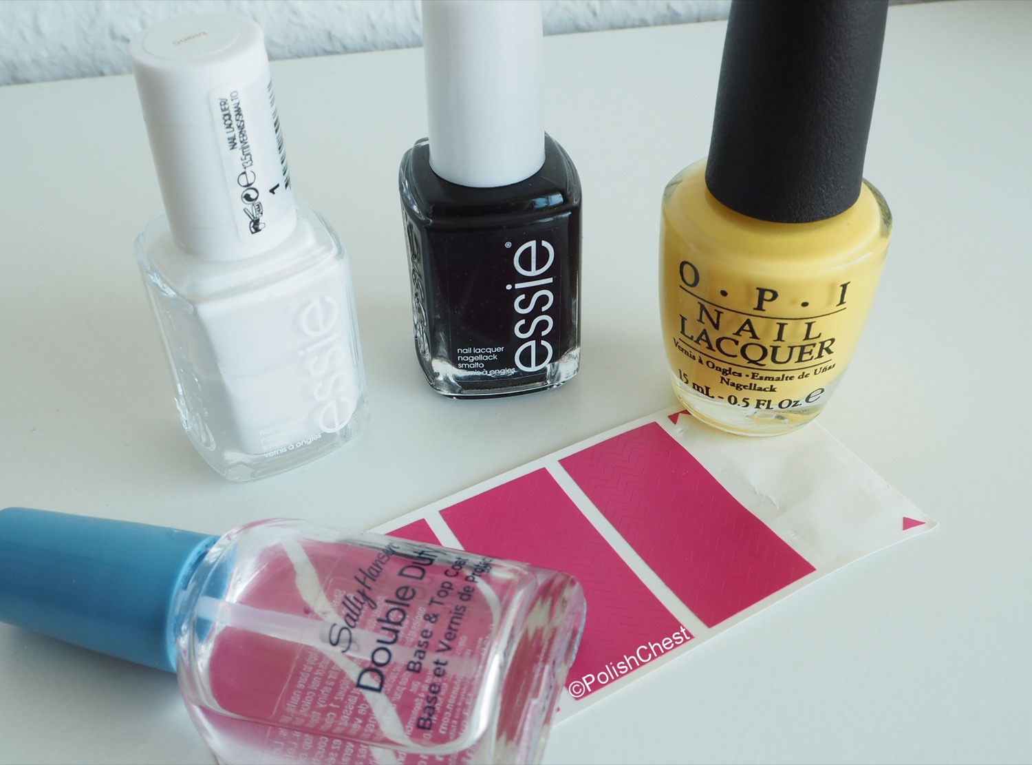 Dieses Design ist ziemlich einfach zu kreieren. Wichtig ist nur, dass die weiße Base komplett getrocknet ist, bevor man die Sticker platziert. Aber dann muss man einfach nur noch die anderen Lacke dorthin pinseln, wo man sie haben will und die Sticker sofort wieder abziehen.