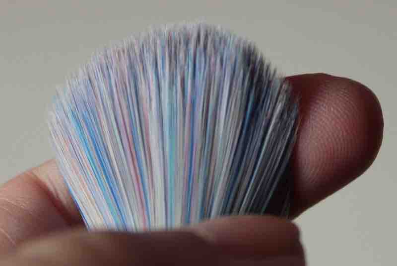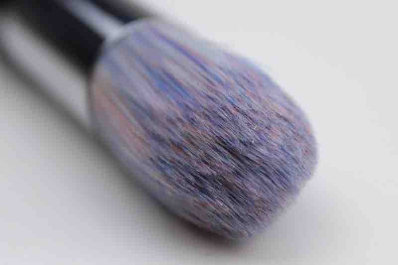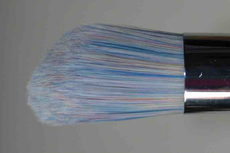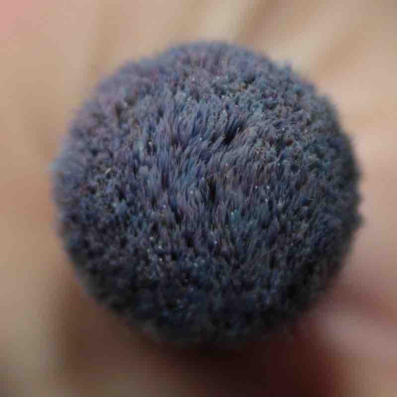 Der Pinsel ist rund und damit bieten viele Borsten ihren äußeren Nachbarn mehr Widerstand als bei flachen Pinseln. Dabei sind die synthetischen Härchen feiner, als der Streifenanblick es vielleicht vermuten lässt. Die Spitzen sind super-fein und sehr zart zur Haut. Dennoch haben auch diese an sich einen festeren Stand – mir persönlich gefällt diese kompakte Anordnung weniger.